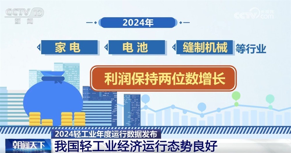 盈利持续改善。2024年,轻工业营业收入利润率为6.54%,比去年提高0.38个百分点,盈利水平持续改善。其中,家电、电池、缝制机械等行业利润保持两位数增长。